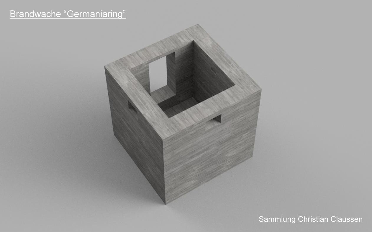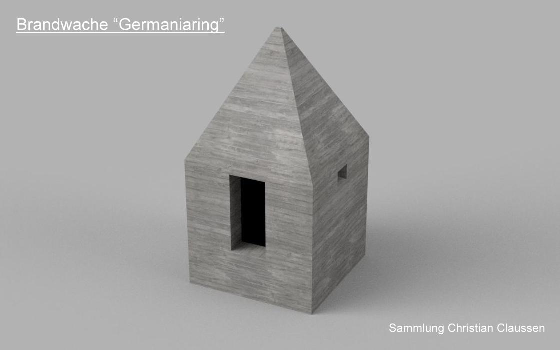Germania Ring Brandwache „Germaniaring / Preetzer-Chaussee“: Die nachfolgenden Dokumente zeigen Unterlagen zum Bau des Bunkers. Das 3D-Modell zeigt die Brandwache so wie sie auf den Bauplänen erscheint.