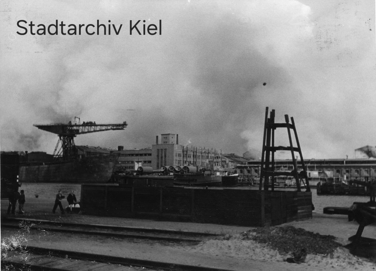 Das Foto unten zeigt den Blick vom Bahnhohfkai zur Germaniawerft nach dem schweren Luftangriff vom 14.5.1943. In der Bildmitte ist die sogenannte Halle 11 mit Stand für leichte Flak zu sehen.