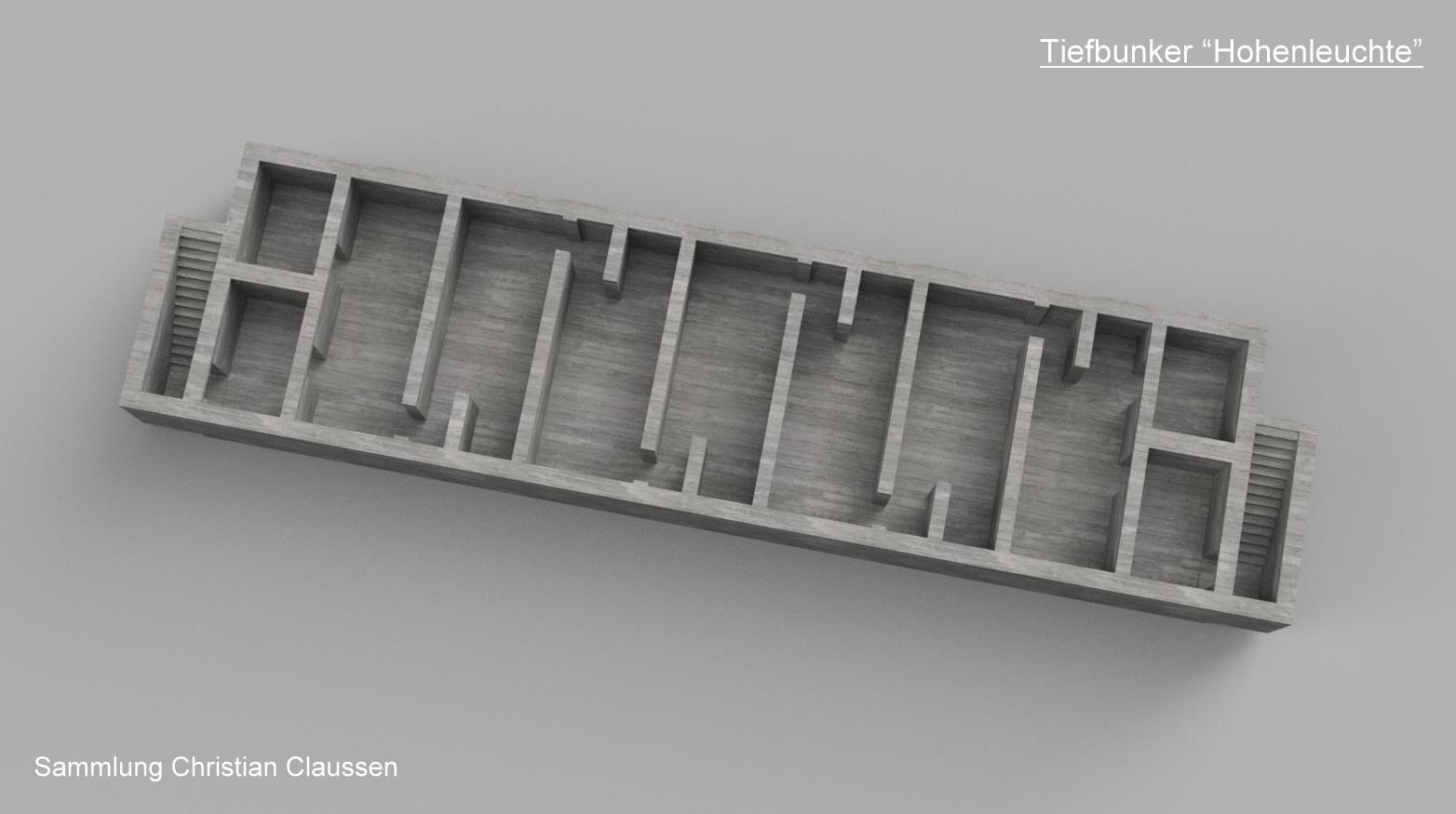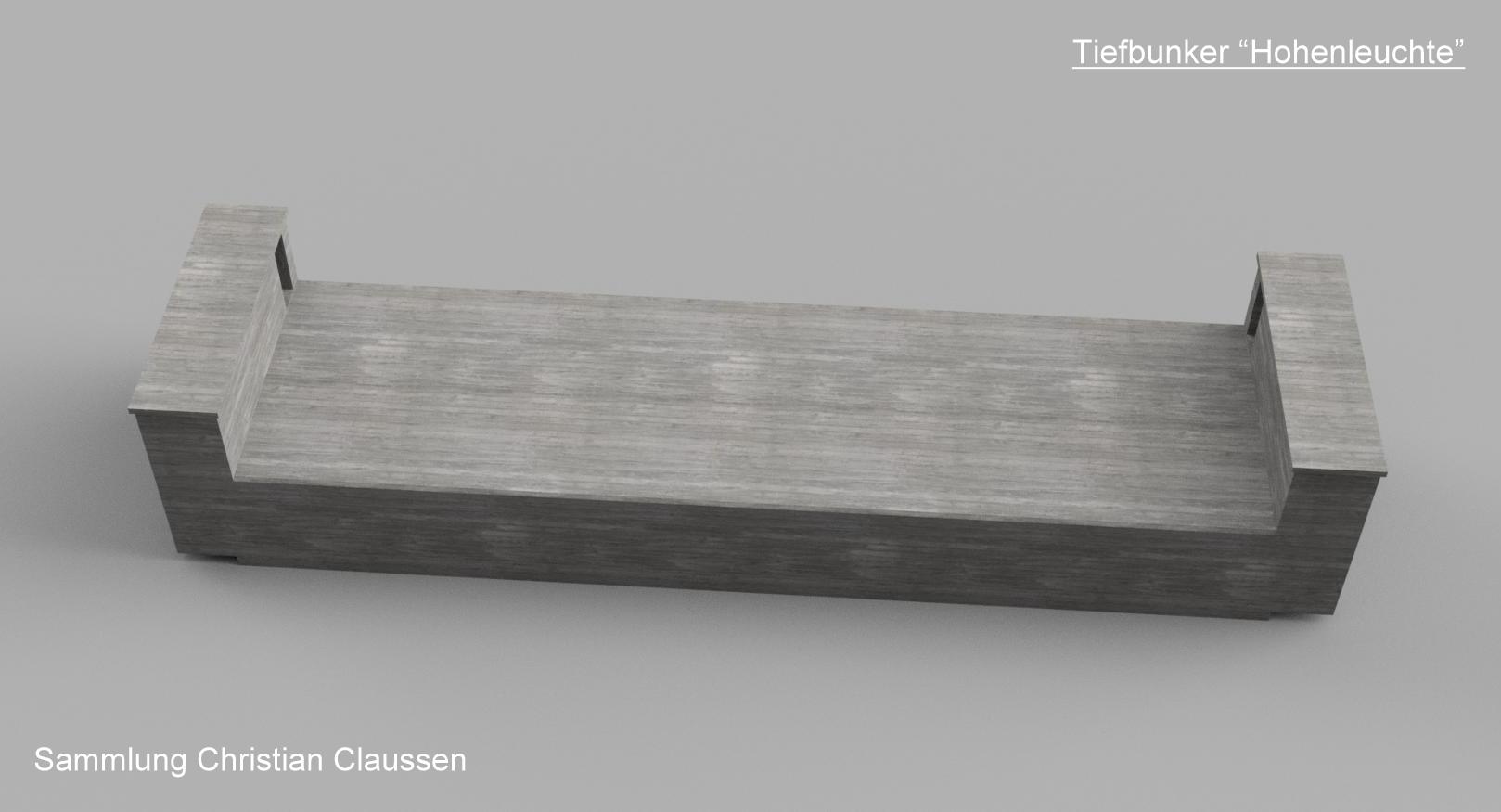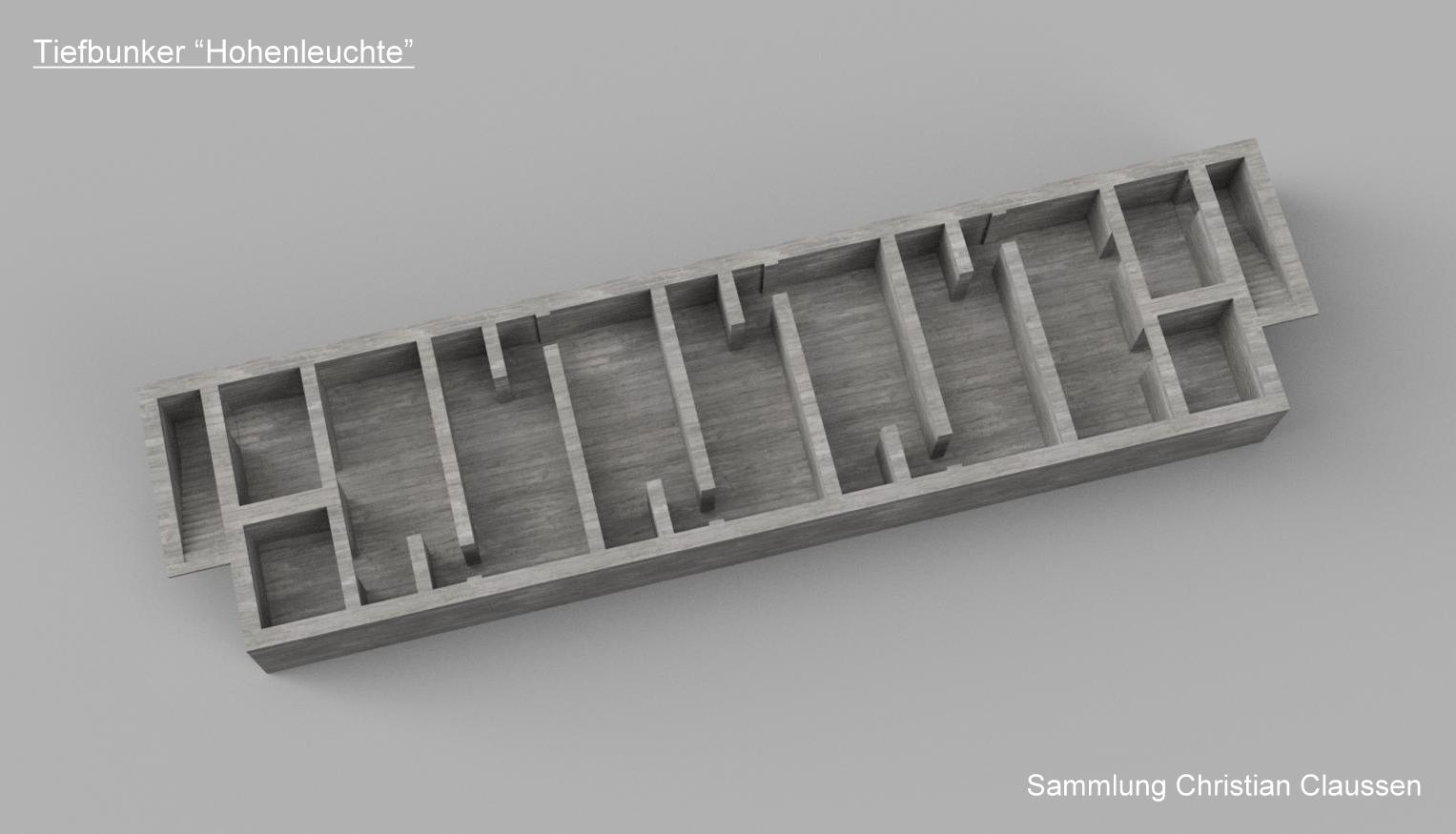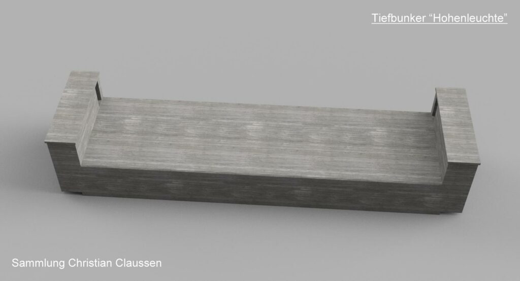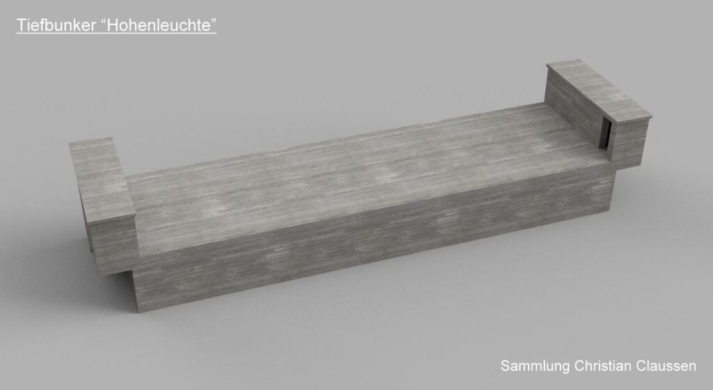 Hohenleuchte Tiefbunker Hohenleuchte: Stockwerke: 1 Nutzfläche: – Fassungsvermögen: – Gesprengt: Entfestigt Deckenstärke: 0,50 Meter Wandstärke: 0,50 Meter Bezeichnung: – Ausführende Firma: – Das 3D-Modell zeigt den Bunker so wie er auf den Bauplänen erscheint.
