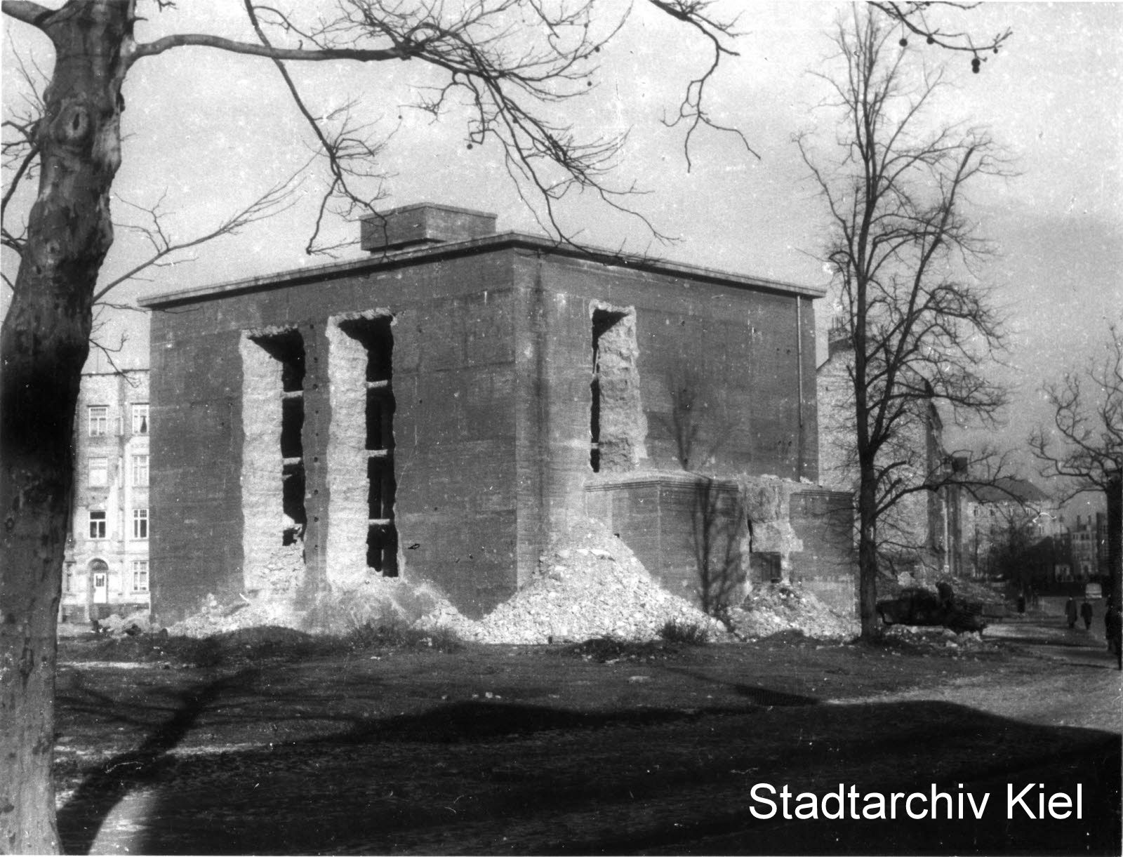 Die beiden Fotos unten zeigen den entfestigten Hochbunker „Schützenpark“ im Jahr 1949.