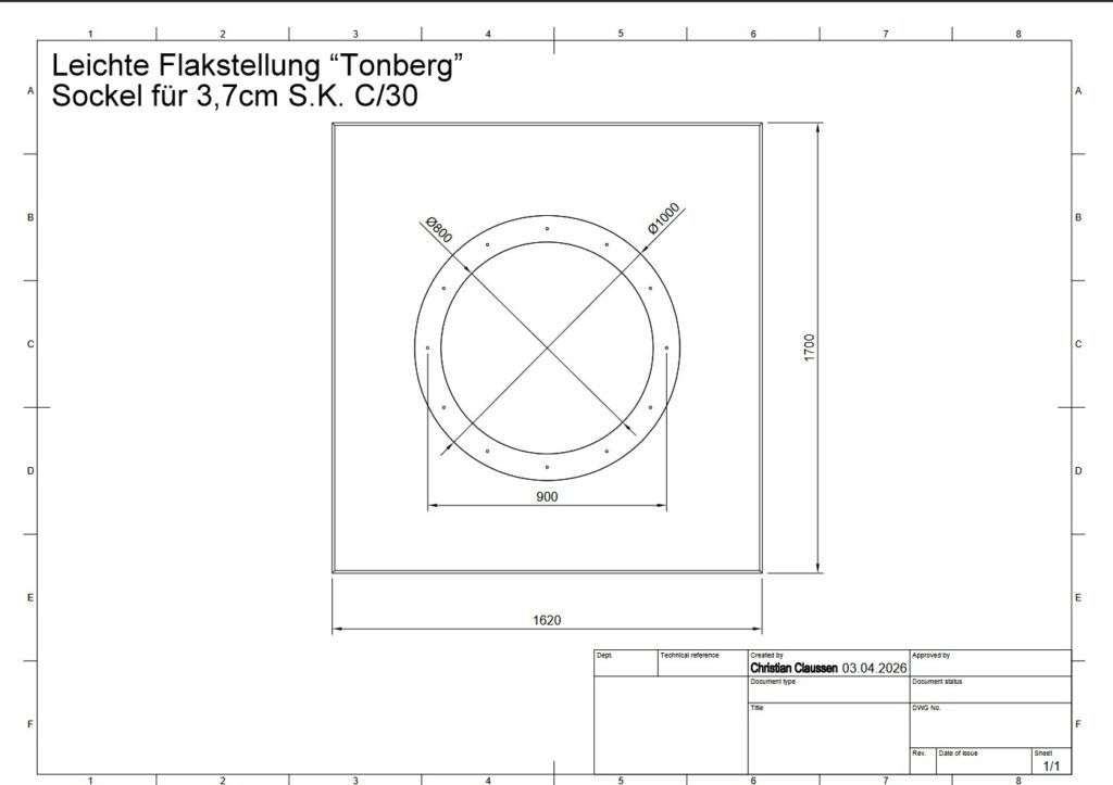 Die unteren Fotos zeigen die Zeichnung und zwei Fotos eines Sockels für eine 3,7cm S.K. C/30 der leichten Flakstellung „Tonberg“.
